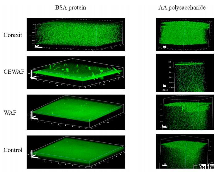 四種治療的共聚焦激光掃描顯微鏡 (CLSM) 帶有模型 EPS 組件的處理如圖 3 所示。 ASW 顯示在左側 BSA 的 0.1% 垂直系列溶液中 右邊是一系列 0.1% 的海藻酸溶液。 橫向, 面板顯示了 Corexit、CEWAF、WAF 的相應處理, 和對照,用于 BSA 和海藻酸溶液。 綠色熒光探針 CTC 突出顯示與陰離子結合的親水性 Ca2+ 多糖和蛋白質的區域。 對于海藻酸和 BSA實驗,單獨使用Corexit就可以分散模型分子 無界面積聚。 圖像也顯示出明亮密集 微聚集體中較高傾向的綠色熒光 Corexit 比在其他治療中看到的要多。 海藻酸面板全部顯示 聚集體的分散,而 BSA 面板顯示主要在界面處的蛋白質。 CEWAF 海藻酸和 BSA 可以生成 清晰的界面層。 CEWAF 中的 BSA 顯示聚合 當它們向上擴散時在垂直方向上被夸大 隨著圖像曝光的時間。 此外,BSA CEWAF 顯示聚集體似乎在液體表面上方,因為它們是 在未顯示的泡沫層之內和之上。 具有主要親水部分的控制處理表現出較少的分散 和不太明顯的界面層。 雖然垂直尺度較小 對于 BSA 圖像比對于海藻酸圖像,仍然很明顯 海藻酸分散在整個體積中,而 BSA 迅速擴散到界面。 唯一的例外是 Corexit 處理顯示沒有界面積聚和完全分散 海藻酸和BSA。