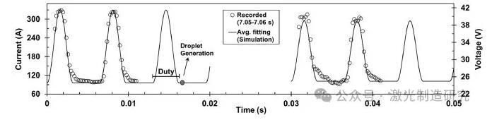 其中,I 1、I 2和P d分別是背景電流、脈沖電流和總波形的脈沖占空比,模擬電流和電壓的相關(guān)波形如圖7所示。記錄的每個(gè)電極的平均功率為4957 J/s,與模擬的平均功率4740 J/s相比,證實(shí)了該模型在5%誤差內(nèi)的準(zhǔn)確性。在整個(gè)模擬時(shí)間內(nèi),一旦脈沖在每個(gè)周期結(jié)束,液滴產(chǎn)生時(shí)間就與波形同步。
