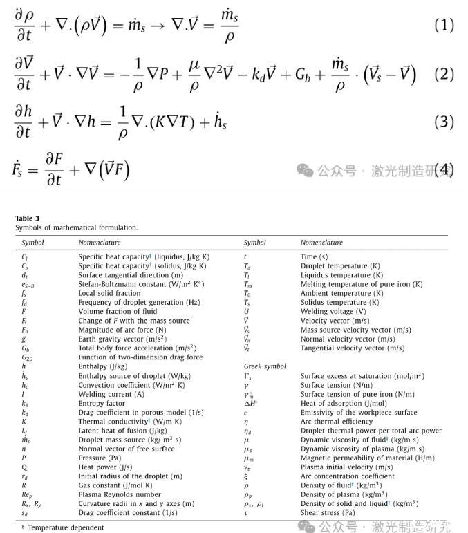 開發(fā)了一個(gè)三維笛卡爾模型來分析TP-GMAW工藝獲得的熔池中的輪廓和對流。在支持相變能力的計(jì)算域中考慮牛頓和不可壓縮流體的層流。熔池由電磁力、浮力和表面張力共同驅(qū)動。為了簡化數(shù)值模型,等離子體熱對液滴的影響通過液滴的初始溫度來考慮。根據(jù)這些假設(shè),總共四個(gè)控制方程(包括質(zhì)量連續(xù)性、動量連續(xù)性(納維爾-斯托克斯)、能量守恒和VOF)根據(jù)方程一起求解。分別為(1)至(4)。表3列出了一系列變量。為了分析熱傳遞和熔池輪廓,采用了FLOW-3D商業(yè)軟件,特別是因?yàn)樵撥浖ㄟ^拉格朗日VOF平流法跟蹤移動的自由表面具有很高的精度。