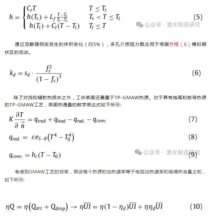 除了對流和輻射熱損失之外,工件表面還暴露于TP-GMAW熱源。對于具有拖尾和前導(dǎo)熱源的TP-GMAW工藝,表面熱通量的數(shù)學(xué)表達(dá)式如下所示: