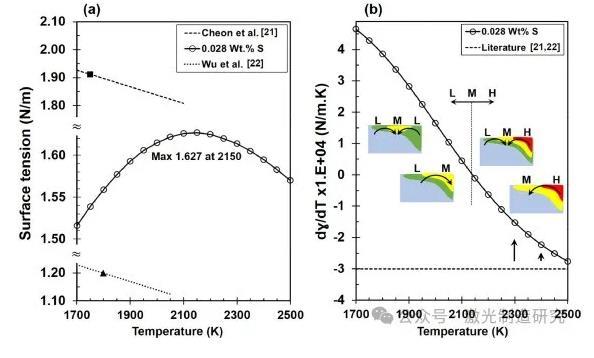 圖6表面張力(a)及其梯度(b)是溫度和硫重量%的函數(shù)。關(guān)于中間范圍(M)的轉(zhuǎn)變溫度,高溫和低溫分別用字母H和L標(biāo)記