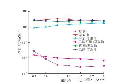 圖4為原油、萃取油以及萃取油分別添加濃度為1%的甲苯洗脫物、乙酸乙酯洗脫物、丙酮洗脫物、乙醇洗脫物配成的模擬油與0.5%,0.8%,1%,1.2%,1.5%,1.7%,2%這七種濃度Na2CO3的界面張力??梢钥闯觯宜嵋阴ハ疵摻M分與堿的界面張力最低。隨著Na2CO3濃度變大,界面張力也持續降低,當Na2CO3濃度達到2%時,其界面張力達到10-3 mN/m。孫景倫等研究了復合驅油體系中堿與原油的相互作用,發現Na2CO3更易于環烷酸以及苯環和不飽和酸部分反應;與飽和酸相比,環烷酸以及苯環和不飽和酸的界面活性更強,導致界面張力更低。