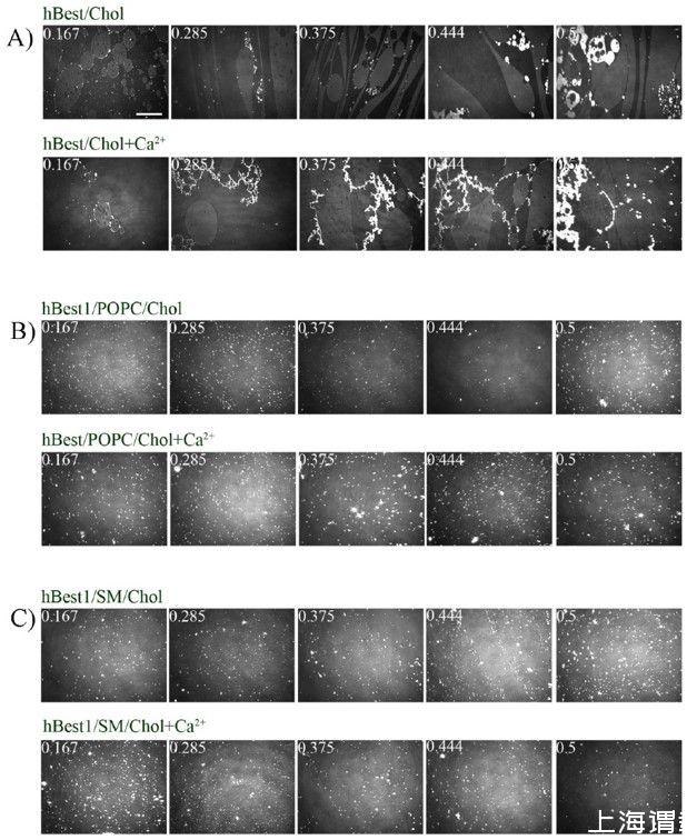 圖2.(A)hBest1/Chol單分子層、(B)hBest1/POPC/Chol(C)hBest1/SM/Chol單分子層的BAM圖像(摩爾分數為Chol 0.167;0.285;0.375;0.444和0.5)Ca 2+的存在與否,在35±2°C。白色比例尺=100μm。
