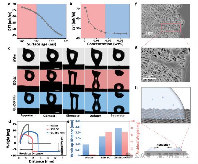 然后,作者研究了GL-SSD NPs液滴在疏水表面的沉積機(jī)理。先是測(cè)量了GL-SSD NPs溶液的動(dòng)態(tài)表面張力(DST)和粘度。DST結(jié)果顯示,GL-SSD NPs溶液在前100 ms內(nèi)發(fā)生輕微變化,這意味著GL-SSD NPs的擴(kuò)散速率較慢,EST值隨著濃度從0到0.018 wt%的增加而減小到45 mN m?1,而當(dāng)濃度高于0.018 wt%時(shí),EST值保持不變。因此,0.018 wt%作為GL-SSD NPs的臨界膠束濃度(CMC)清楚地觀察到接近、接觸、伸長(zhǎng)、變形和分離的順序過(guò)程。從PTFE表面分離后,水滴從表面被徹底清除,沒(méi)有留下任何殘留物,而SSD SC和GL-SSD NPs液滴在中間發(fā)生了明顯的伸長(zhǎng)和斷裂,在表面保留了大量的液體。水、SSD SC和GL-SSD NPs的殘余質(zhì)量分別為0.35、6.9和6.8 mg,而GL-SSD NPs溶液的破裂距離為2.43 mm,遠(yuǎn)高于水和SSD SC的0.97 mm和1.68 mm,表明GLSSD NPs與PTFE表面的相互作用最強(qiáng)。此外,掃描電鏡(SEM)圖像顯示,撞擊后的縮回軌跡中留下了大量的液滴殘留物。在液滴撞擊過(guò)程中,大量GL-SSD NPs在三線(xiàn)處的沉積會(huì)利用PTFE表面固有的親水性改變其潤(rùn)濕性,產(chǎn)生固定點(diǎn),延緩液滴縮回。