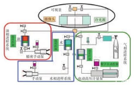 潤濕性及界面張力儀主要包括常溫常壓型、高溫型、超高溫型、便攜型,其中高溫高壓型潤濕性及界面張力儀能夠真實模擬油藏條件測量接觸角和界面張力。為了擴展高溫高壓潤濕性及界面張力儀可以測量二氧化碳與原油最小混相壓力功能,且可以使常溫凝固的稠油等樣品,實現順利進樣測量和測量,需要對現有設備進行改造。通過增加高溫高壓氣體進樣系統,改進原有油相、水相進樣系統,使其功能得到擴展。
