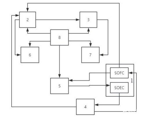 所述供電模塊1包括SOFC-SOEC電池1-1、工業(yè)用電單元1-2、逆變器1-3、高頻感應電源1-4,所述工業(yè)用電單元1-2分別與所述SOFC-SOEC電池1-1中的SOEC電解池、所述等離子噴射模塊2連接,所述儲氫模塊4分別與所述SOEC電解池、SOFC燃料電池、等離子噴射模塊2連接,將SOEC電解池電解氫收集存儲的氫氣用于SOFC燃料電池使用、為等離子噴射模塊2中等離子噴射器供應電離氣體(氫氣);所述SOFC燃料電池、SOEC電解池均與所述蓄熱模塊5連接。
