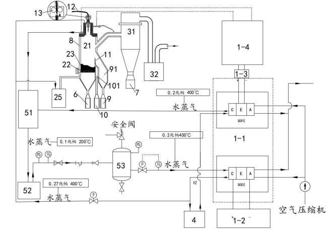 所述供電模塊1中的SOFC燃料電池產(chǎn)生的水蒸氣(0.2Mpa,400℃)進入所述汽水混合加熱器51中,所述等離子噴射模塊2、分離過濾模塊3、粗粉收集罐6、細粉收集罐7與冷卻模塊8換熱后的水(當冷卻介質(zhì)為水時)也進入所述汽水混合加熱器51中,通過所述汽水混合加熱器51的作用將其轉(zhuǎn)化為水蒸氣并傳輸?shù)剿稣羝l(fā)生器52中,所述蒸汽發(fā)生器52將水蒸氣以(0.2Mpa,400℃)的狀態(tài)傳輸?shù)椒€(wěn)壓罐53中,通過穩(wěn)壓罐53穩(wěn)壓并去除水蒸氣中夾雜的水滴后,高溫的水蒸氣進入SOEC電解池中參與電解制氫,并通過儲氫模塊4將制備的氫氣存儲備用。該過程將分離提純過程中供電模塊1中燃料電池燃燒放電產(chǎn)生的高溫水蒸氣與冷卻換熱的熱量加以回收利用,為SOEC電解池提供熱量,避免或減少外部能量的輸入,降低成本。