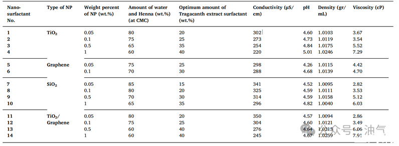 本研究研究了石墨烯、二氧化鈦(TiO2)和二氧化硅(SiO2)納米顆粒、TiO2和石墨烯的復(fù)合納米粒子以及指甲花提取物表面活性劑的納米復(fù)合物對(duì)降低油水界面張力的影響。研究人員使用溶膠-凝膠技術(shù)合成上述納米顆粒,并采用天然水性懸浮表面活性劑(黃芪膠提取物)對(duì)納米表面活性劑的穩(wěn)定性進(jìn)行了研究。通過(guò)電導(dǎo)率、濁度和界面張力實(shí)驗(yàn)測(cè)定了指甲花提取物表面活性劑的CMC值。為了穩(wěn)定重量百分比不同且納米顆粒類型也不同的納米表面活性劑,使用粒徑和zeta電位測(cè)量來(lái)確定黃芪膠表面活性劑各自的最佳濃度。最后,通過(guò)界面張力測(cè)量,使用穩(wěn)定的納米表面活性劑來(lái)研究其對(duì)IFT的影響。