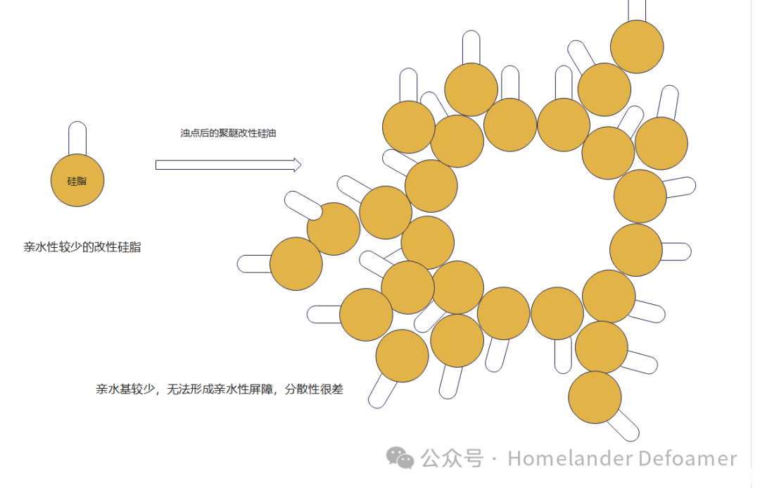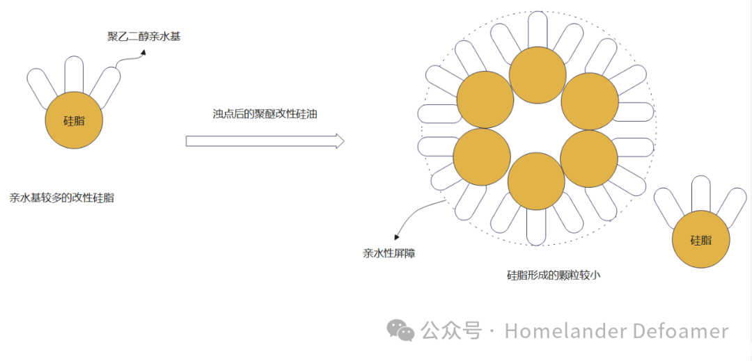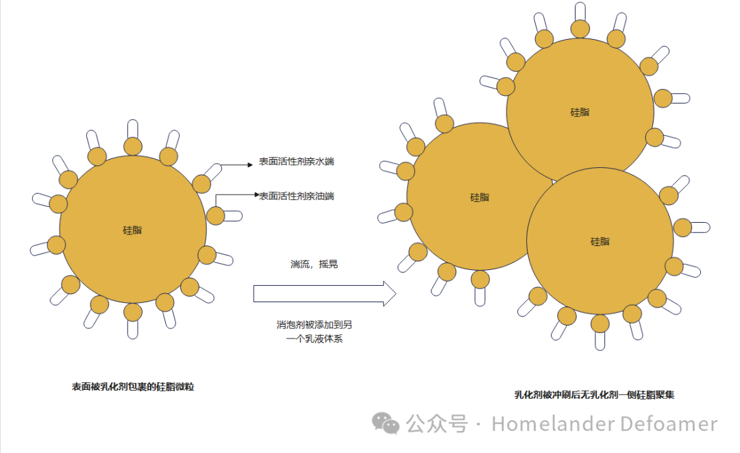 乳化劑既然很容易脫落,那么可以用化學(xué)鍵的方式,把乳化劑接枝在硅脂上,這樣即使析出,在沒有外加乳化劑和剪切力的情況下也能將析出的硅脂分散到體系中。這對親水基與親油基分子量的把控極其重要。若親水基太大,形成水包油的顆粒太小,雖然不析出。但是太小的微粒排液時間久,消泡速度就很慢。