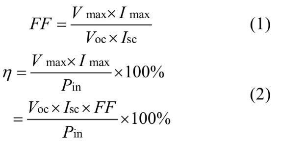 其中Vmax和Imax為最大輸出功率時(shí)對(duì)應(yīng)的電壓和電流,Pin為入射光強(qiáng)。