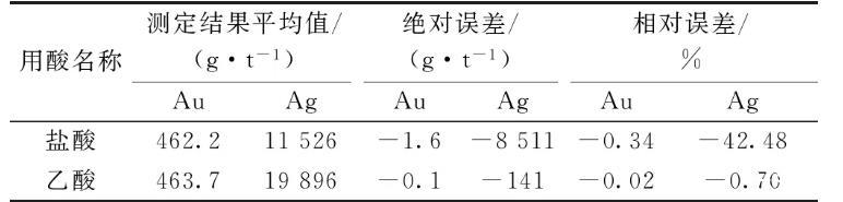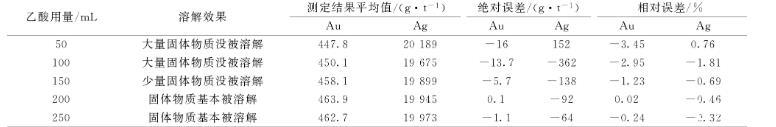 實(shí)驗(yàn)樣品金含量463.8 g/t,銀含量20 037 g/t,進(jìn)行除鉍用酸量的實(shí)驗(yàn),試驗(yàn)用酸為乙酸(1+1),結(jié)果見表5,從結(jié)果可以看出50、100 mL乙酸用量,大部分固體物質(zhì)沒被溶解,大部分鉍沒被除去,乙酸用量200 mL時,固體物質(zhì)基本被溶解,結(jié)果較準(zhǔn)確,可以滿足測定要求。在結(jié)果準(zhǔn)確的情況下選擇用量少的,所以實(shí)驗(yàn)選擇乙酸用量為200 mL。