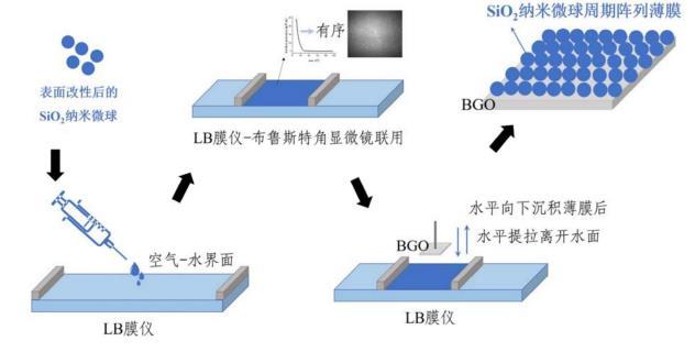 采用納米顆粒直徑為150~450nm的二氧化硅,利用LB膜技術,在20℃條件下,以小于25mm/min的速度在空氣?水界面上側向壓縮單層膜,表面壓力為24~36mN/m時,以0.7~2mm/min的速度垂直提拉單層膜,制備方法簡單、薄膜有序性良好、制作面積大、價格便宜、可批量化處理,適合在工業化大規模生產實踐中推廣,在BGO表面制備有序性較高的二氧化硅單層薄膜,增強BGO閃爍體光提取效率。
