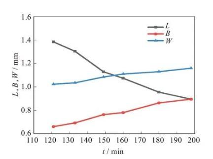 可以看出,從121 min開始,可以觀察到橢球形液滴已經(jīng)初步形成,即從121 min開始計算橢球形液滴的三軸長度,根據(jù)實驗裝置圖,L和B為x和y方向的液滴長度,W為z方向的長度,根據(jù)公式W=R03/(LB)計算得到。
