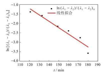 通過實驗可以得到L和B的時間演化,界面張力可以通過ln(λ1-λ2)/(λ1-λ2)0~t的斜率求得。通過軟件擬合出的形狀因子隨時間演化的圖形如圖5所示。利用式(1)~式(3)計算得到,PS/POE體系在230℃時系統(tǒng)的界面張力為0.397 mN/m。