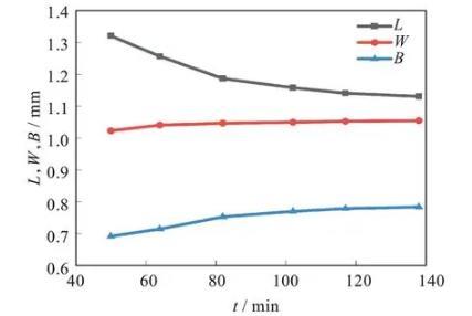 圖7為數值仿真過程中液滴三軸隨時間演化規律。綜合對比圖4和圖7,數值仿真軟件與實驗過程中球形液滴的三軸長度變化趨勢基本一致。可以看出,在體積保持不變的假設下,球形液滴的第二半軸和第三半軸變形頻帶是不一致的。該結果表明一些黏彈性液滴的變形和收縮不嚴格符合仿射變形假設(即第三半軸W始終等于第二半軸B),這與文獻結果類似。數值仿真結果中液滴最終形態不是一個三軸長度相等的球形,主要原因是仿真過程中使用的非牛頓流體的本構模型只對黏性項進行了修改,而忽視了彈性應力的影響,因此與理論計算結果有一定誤差。