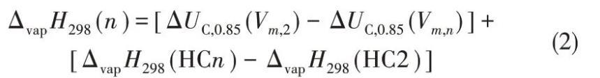 式中,ΔUC,0.85(Vm,n)是摩爾體積為Vm,n時的庫侖能;Vm(HCn)和ΔvapH298(HCn)分別為直鏈烴CnH2n+2的摩爾體積和汽化熱;Vm,n為[Cnmim][Tf2N]的摩爾體積。