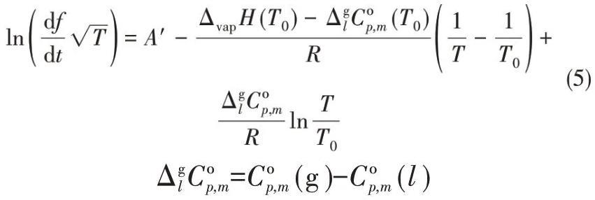 Verevkin等[54]開發了評估程序的物理基礎,并使用1-乙基-3-甲基咪唑雙(三氟甲磺酰基)酰亞胺[C2mim][Tf2N]進行測量,從而將蒸發焓的測量范圍降低到363 K。和文獻中已有的數據相比較,具有一致性。這項工作中開發的方法也為得到ILs的汽化焓開辟了一條新途徑。經過一系列公式推導,構建了ILs的摩爾汽化焓、頻率損耗率df/dt和溫度的關系