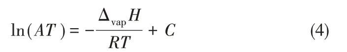 將ln(AT)對1/T作圖,回歸線性方程,從斜率可以得出ILs的汽化焓數據。