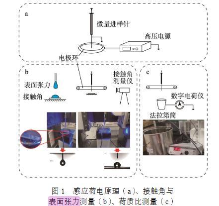 圖1感應荷電原理(a)、接觸角與表面張力測量(b)、荷質比測量(c)
