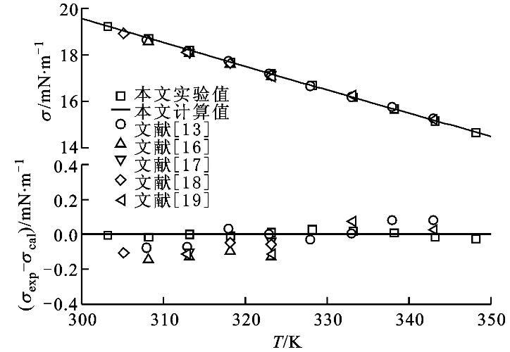 圖3正庚烷表面張力實(shí)驗值與擬合方程和文獻(xiàn)值的比較