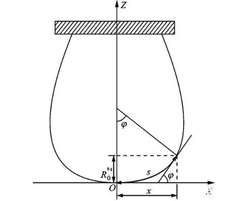 懸滴法利用測定處于重力與表面張力平衡狀態(tài)的液滴外形,獲得待測液體的表面張力。懸滴外形的幾何關(guān)系如圖1所示,在考慮液體靜壓作用的基礎(chǔ)上,由經(jīng)典Young-Laplace方程推導(dǎo)得歸一化Bashforth-Adams工作方程為,式中:σ為表面張力;φ表示外形輪廓線某點(diǎn)切線與橫坐標(biāo)夾角;s為弧長;R0為頂點(diǎn)曲率半徑;ρl、ρg分別表示液相和氣相密度;g代表當(dāng)?shù)刂亓铀俣?,本文取?.7965 m·s-2。