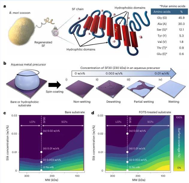 圖1作為天然表面活性劑的SF。b,旋轉涂層金屬水合物提高表面覆蓋率的示意圖。金屬水合物溶液的表面覆蓋率的示意圖。c,d,添加了SF的金屬水溶液的表面覆蓋率(%)。的表面覆蓋率(%)?;祝╟)和基底上的表面覆蓋率(%)。基底(d)上SF添加的金屬水溶液的表面覆蓋率(%)與濃度和分子量的函數關系。