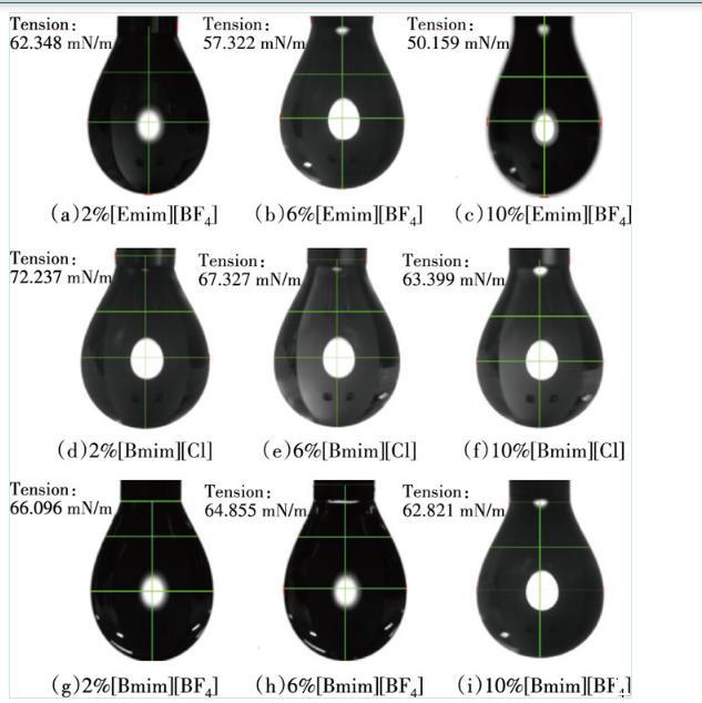 1)表面張力測試。在室溫為25℃的環境中,利用電子天平將[Emim][BF4]、[Bmim][Cl]、[Bmim][BF4]分別配制質量分數為0.6%、0.7%、0.8%、0.9%、1%、2%、3%、4%、5%、6%、7%、8%、9%、10%的活性水溶液,測定不同質量分數下離子液體溶液的表面張力3次,取平均值。