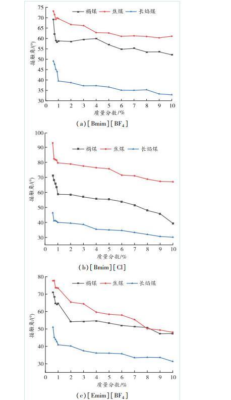 1)添加離子液體后,各活性水溶液接觸角均小于純水,隨著離子液體質量分數增大,3種活性水溶液的接觸角都迅速減小。這是因為離子液體能迅速與煤塵表面形成較強的分子間作用力,咪唑環上的H原子、烷基側鏈上的H原子均可與煤中的—OH、—COOH等基團形成氫鍵,破壞煤中原有氫鍵,同時其正負電子轉移到煤表面,破壞煤中共價鍵,提高離子液體對煤的溶解能力。