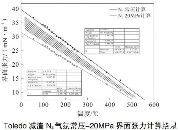 可以看到,根據(jù)文獻方法計算結果,對于Toledo減壓渣油來說,其在常壓條件下N2氣氛條件下的氣液界面的界面張力,當不在真臨界溫度(760℃)較近的溫度范圍內,都可以認為隨溫度呈現(xiàn)線性下降的趨勢。