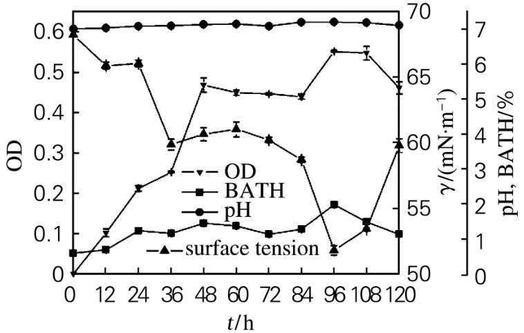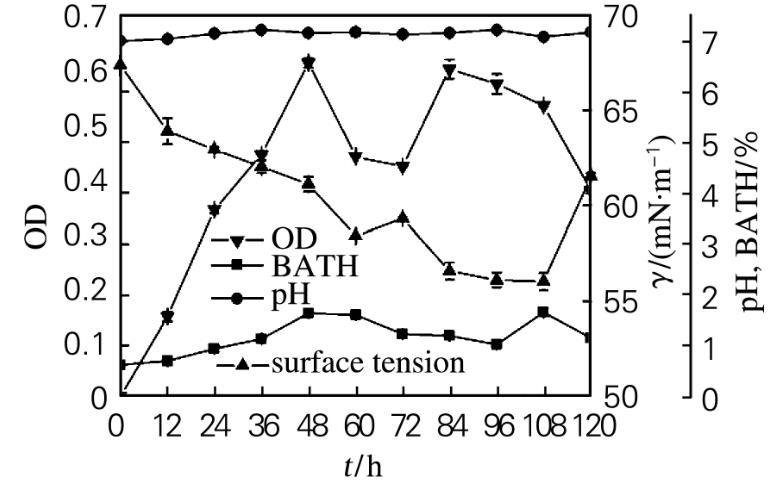 生物表面活性劑產生菌菌體密度、細胞疏水性與發酵液pH及表面張力的關系(一)