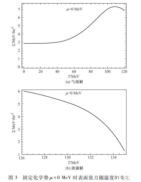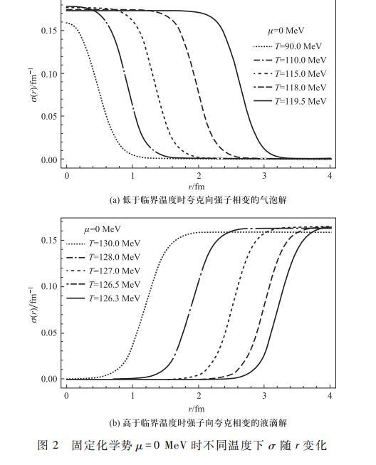 值得指出的是,對(duì)于液滴解,由圖1可以看出在更高溫度時(shí),在σ=σv處的極小值將會(huì)消失,即偽真空消失。此時(shí)全空間將是均勻的夸克相,相變已經(jīng)完成,液滴解也隨之消失,所以在更高溫度區(qū)域不存在液滴解。