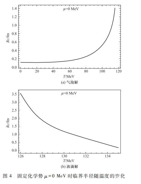 反過來,圖2(b)所示的液滴解中同樣可做類似討論。液滴解曲線的拐點(diǎn)處也可以粗略看做液滴的臨界半徑,隨著溫度的逐漸降低而靠近相變臨界溫度,液滴解的半徑逐漸增加,同樣在接近臨界溫度處液滴解隨溫度的變化明顯大于遠(yuǎn)離臨界溫度處時(shí)的變化。這就是說,在強(qiáng)子背景中產(chǎn)生了許多大小不一的夸克液滴,當(dāng)溫度靠近臨界溫度時(shí),由于此時(shí)對(duì)應(yīng)液滴的臨界半徑較大,因此許多隨機(jī)產(chǎn)生的液滴難以達(dá)到臨界液滴的半徑就在產(chǎn)生后在表面張力作用下收縮消失了;但當(dāng)溫度逐漸升高,液滴的臨界半徑減小,將會(huì)存在越來越多隨機(jī)產(chǎn)生的半徑大于臨界半徑的液滴,這些液滴發(fā)生膨脹并彼此間相互合并最終充滿整個(gè)空間完成相變過程。