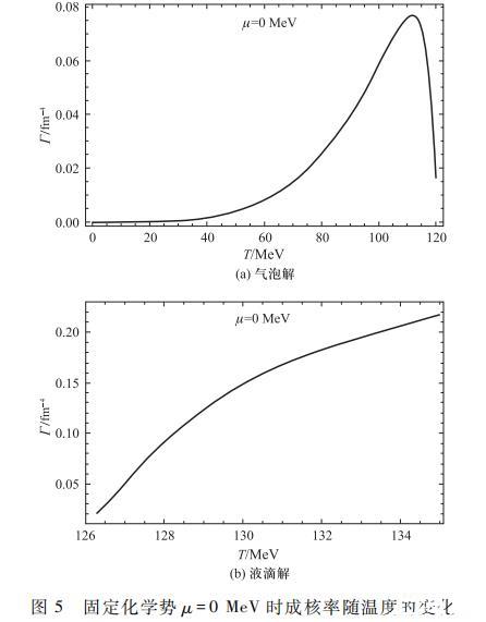 特別需要說明的是在臨界溫度附近,當(dāng)式(17)中的指數(shù)部分ΔFb/T≌1時(shí)對(duì)應(yīng)的溫度在一級(jí)相變的過程中具有重要意義,其標(biāo)示了亞穩(wěn)相真正向穩(wěn)定相發(fā)生實(shí)際轉(zhuǎn)變的開始。以氣泡解為例,當(dāng)ΔFb/T≌1時(shí),Γ的指數(shù)項(xiàng)變?yōu)?/e,此時(shí)對(duì)應(yīng)的溫度為T1=118.1 MeV,這說明在Tc=119.8 MeV和T1=118.1 MeV之間系統(tǒng)能夠在相對(duì)長(zhǎng)的時(shí)間內(nèi)保持在夸克相亞穩(wěn)態(tài)。但當(dāng)溫度進(jìn)一步降低時(shí),夸克相亞穩(wěn)態(tài)才會(huì)實(shí)際上通過氣泡動(dòng)力學(xué)過程快速地向穩(wěn)定強(qiáng)子相轉(zhuǎn)變,即液相背景中快速產(chǎn)生強(qiáng)子氣泡并迅速膨脹合并從而完成相變過程。液滴解中的物理過程完全類似,液滴解在T2=127.3 MeV時(shí)有ΔFb/T≌1,表明在Tc=119.8 MeV和T2=127.3 MeV之間系統(tǒng)能夠在相對(duì)長(zhǎng)的時(shí)間內(nèi)保持在強(qiáng)子相亞穩(wěn)態(tài),只有當(dāng)溫度進(jìn)一步升高到超過T2=127.3 MeV時(shí),系統(tǒng)將通過液滴成核的動(dòng)力學(xué)過程快速向夸克相轉(zhuǎn)變。當(dāng)溫度升高至Tsp=142.8 MeV時(shí),強(qiáng)子的亞穩(wěn)態(tài)真空完全消失,如果此時(shí)相變還沒有全部完成,那么系統(tǒng)會(huì)發(fā)生劇烈的強(qiáng)子相到夸克相的轉(zhuǎn)變過程。
