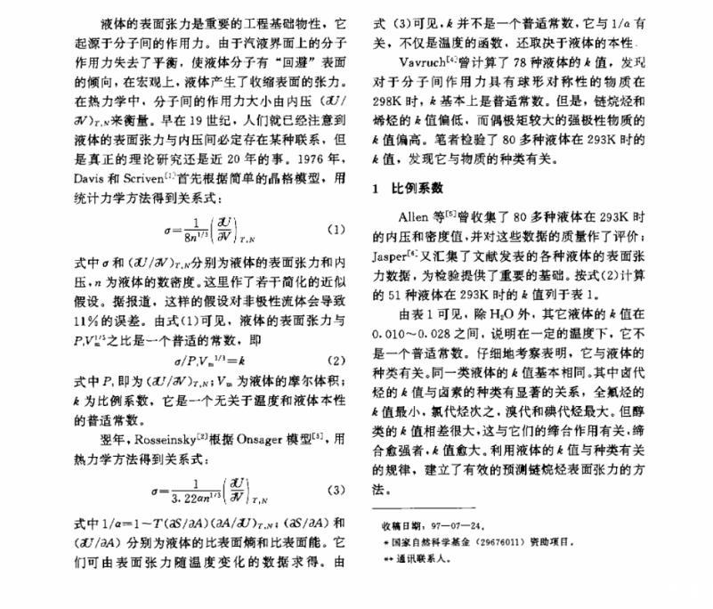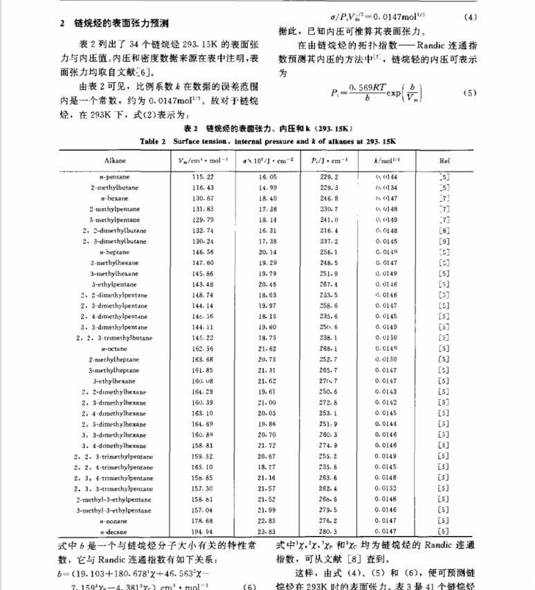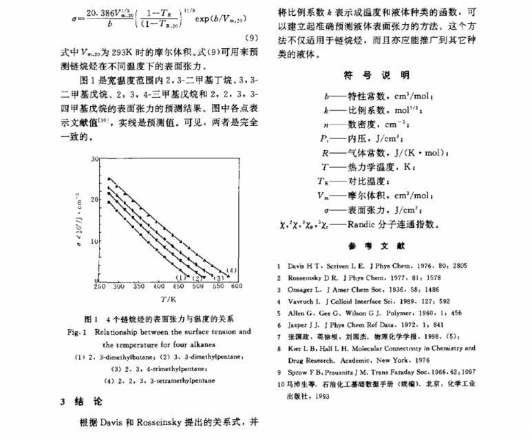 對Davis和Rosseinsky提出的關(guān)系檢驗表明,液體的表面張力σ與P1Vm1/3之比不僅取決于溫度,還與液體的種類有關(guān),據(jù)此,建立了一個能由鏈烷烴的分子結(jié)構(gòu)準(zhǔn)確預(yù)測其表面張力的方法。