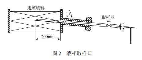 全塔共設(shè)有4個(gè)取樣口。1#取樣口設(shè)在塔頂回流處;2#取樣口設(shè)在距填料底部1200mm處;3#取樣口設(shè)在距填料底部400mm處;4#取樣口設(shè)在填料段以下。填料段的取樣口,即2#、3#取樣口的樣式如圖2所示。取樣器沿水平方向向上傾斜3°放置,伸入填料段的部分為半圓管,長(zhǎng)度為200mm,直徑為10mm。這樣設(shè)計(jì)以保證液相樣品順利地由填料中取出,且取出的液相樣品具有代表性。