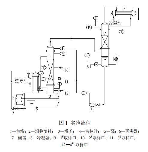 實(shí)驗(yàn)流程如圖1所示。實(shí)驗(yàn)裝置由主塔、副塔、冷凝系統(tǒng)、加熱系統(tǒng)四大部分組成。主塔為內(nèi)徑400mm的不銹鋼精餾塔,填料層裝填高度1.8m,每盤(pán)填料高200mm,共9盤(pán)。主塔塔頂上升蒸汽及其冷凝液在副塔內(nèi)進(jìn)行換熱,得到飽和的回流液,避免過(guò)冷現(xiàn)象的發(fā)生。塔釜再沸器采用熱導(dǎo)油加熱,換熱面積為27.5m2。塔頂冷凝器采用冷卻水制冷,換熱面積為29.9m2。實(shí)驗(yàn)采用常壓下的全回流操作。
