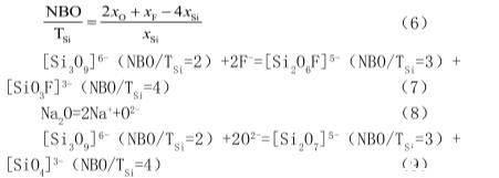 熔體表面張力與熔渣結(jié)構(gòu)的聚合程度密切相關。連鑄結(jié)晶器保護渣屬于硅酸鹽,硅酸鹽熔體中含有不同聚合程度的硅氧陰離子團。熔渣結(jié)構(gòu)的聚合程度用符號“NBO/TSi”表示,其計算公式如式(4)所示。NBO/TSi值越小,說明熔體聚合程度越高。將預熔渣和靜滴法測定后的渣樣成分分別帶入到式(6)中,計算結(jié)果如表2所示。從表中可以看出,靜滴法測定后渣樣的NBO/TSi值小于預熔渣的NBO/TSi值,說明靜滴法測定后的渣樣熔體結(jié)構(gòu)聚合程度高于預熔渣熔體結(jié)構(gòu)聚合程度。這是由于F-能降低熔渣結(jié)構(gòu)的聚合程度,將高聚合程度的硅氧陰離子團逐漸解聚成低聚合程度的硅氧陰離子,同時Na2O電解出O2-,O2-的出現(xiàn)亦可降低熔體的聚合程度,反應式見(7)~(9):