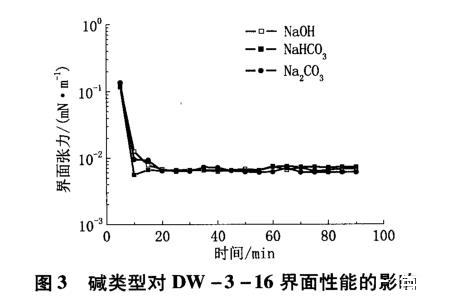 圖3堿類(lèi)型對(duì)DW-3-16界面性能的影響