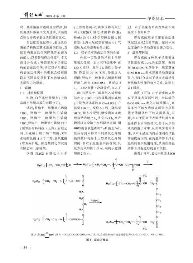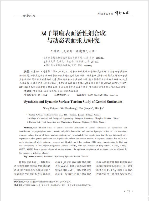 以異構(gòu)十三醇聚氧乙烯醚、順酐、丁二醇和亞硫酸氫鈉為原料合成4種陰-非離子雙子星座表面活性劑,并探究其水溶液的動(dòng)態(tài)表面張力隨溫度的變化特性。結(jié)果表明,異十三醇聚氧乙烯醚雙子星座表面活性劑因其具有異構(gòu)的烷基、聚醚鏈段和雙子星座的結(jié)構(gòu),能顯著降低水溶液的表面張力,使其具有在高、低溫中可變的HLB值特性,具有更高的高溫表面活性;隨著溫度的升高,G1300、G1303、G1305、G1310的表面張力都有較大程度降低;表面活性劑使用的最佳溫度,可以通過(guò)調(diào)節(jié)聚醚鏈節(jié)數(shù)加以調(diào)節(jié)。