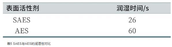 潤(rùn)濕性是表面活性劑的基本應(yīng)用性能之一。帆布沉降法測(cè)定的是表面活性劑溶液對(duì)棉布的潤(rùn)濕效果,潤(rùn)濕過程的快慢取決于表面活性劑的性質(zhì)。由表5可知,SAES、AES對(duì)帆布片的潤(rùn)濕時(shí)間分別為26 s和60 s,表明SAES的潤(rùn)濕性優(yōu)于AES,這是由于SAES結(jié)構(gòu)中存在支鏈,表面活性劑分子從水溶液中遷移到氣-液界面的速率較快,容易擴(kuò)散到纖維表面,降低帆布片表面張力的能力較強(qiáng),從而具有較好的潤(rùn)濕性。