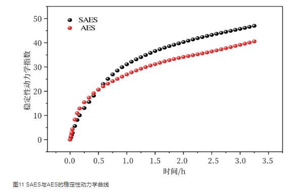 穩(wěn)定性動(dòng)力學(xué)指數(shù)(di)反映的是樣品在整個(gè)放置時(shí)間濃度和顆粒粒徑的變化幅度的綜合值,穩(wěn)定性動(dòng)力學(xué)指數(shù)越大,系統(tǒng)越不穩(wěn)定。圖11為SAES與AES的穩(wěn)定性動(dòng)力學(xué)曲線,從圖中可以看出,在開始的0.5 h內(nèi),SAES與AES的穩(wěn)定性動(dòng)力學(xué)指數(shù)幾乎相同,但隨著時(shí)間的增加,SAES的穩(wěn)定性動(dòng)力學(xué)指數(shù)明顯高于AES,說明在開始的0.5 h內(nèi),二者的泡沫穩(wěn)定性幾乎相同,但是隨著時(shí)間的延長(zhǎng),SAES體系的穩(wěn)泡性明顯弱于AES,這是由于帶有一定支鏈的SAES分子在氣-液界面上形成的表面膜黏度低,不夠緊密結(jié)實(shí),泡沫穩(wěn)定性較差。