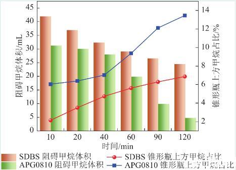 通過式(4)計算得到泡沫中注入氣體含量。圖10中柱狀圖可以看出,SDBS溶液泡沫對甲烷的束縛效果明顯優(yōu)于APG0810,APG0810溶液由于發(fā)泡性及泡沫穩(wěn)定性均弱于SDBS,故對甲烷束縛能力較差。質量分數(shù)為0.05%的SDBS可控制27.43 mL甲烷,0.15%的SDBS可控制43.649 mL甲烷,占總注入甲烷體積87%。質量分數(shù)為0.15%的APG0810溶液可控制31.33 mL甲烷,占總注入甲烷體積62.6%。