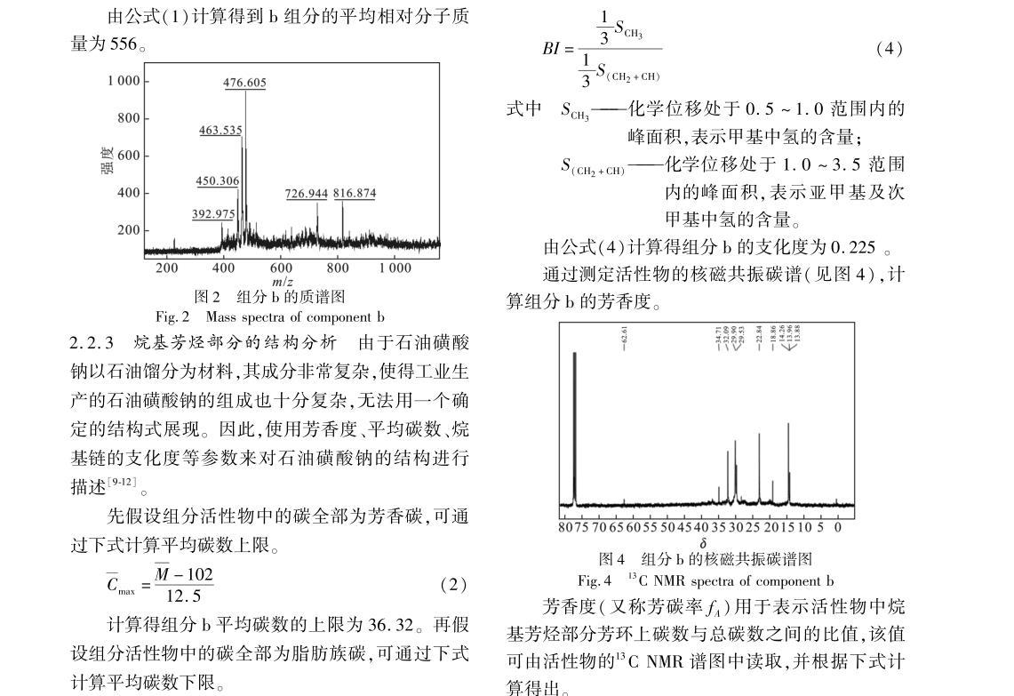 由上可知,只有組分b的界面張力達到超低,說明石油磺酸鹽中主要起作用的物質(zhì)集中在組分b中,因此對組分b采用紅外光譜、質(zhì)譜、核磁共振等方法測定其結(jié)構(gòu),并通過理論計算與實驗數(shù)據(jù)相結(jié)合,推斷組分b的大致分子結(jié)構(gòu)。