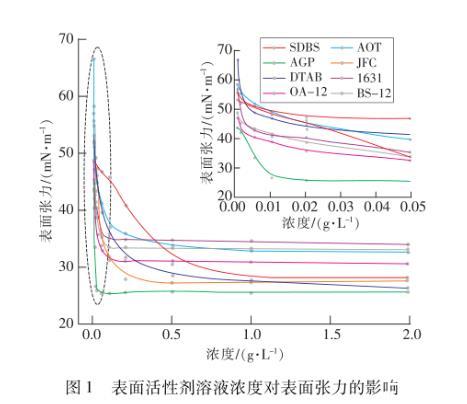 表面活性劑溶液的表面張力與濃度及自身性質(zhì)密切相關(guān)。在達(dá)到臨界膠束濃度之前,溶液濃度越大,表面張力越小。在8種表面活性劑中,陽(yáng)離子及兩性型表面活性劑雖然具有較低的臨界膠束濃度,但是降低表面張力的能力較差;陰離子表面活性劑的臨界膠束濃度值最高,但在降低溶液表面張力方面性能優(yōu)越;非離子表面活性劑APG形成膠束能力、降低表面張力能力均為最強(qiáng)。