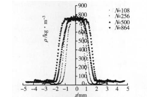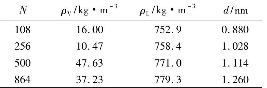 在溫度500 K和截?cái)喟霃絩c=0.9498 nm的條件下,當(dāng)模擬分子數(shù)N=108、256、500和864時,模擬得到的密度分布見圖9。統(tǒng)計(jì)得到的汽相主體密度ρV、液相主體密度ρL及汽液界面厚度d見表5。