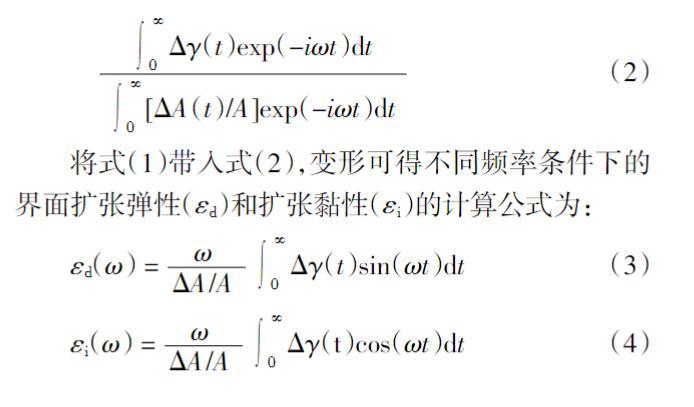對于一個(gè)幅度為ΔA的瞬間界面形變過程,在形變停止后,在一定頻率(ω)下擴(kuò)張頻率模量(ε)的數(shù)值可以通過對界面張力衰減曲線的Fourier變換得到,如式(2)所示: