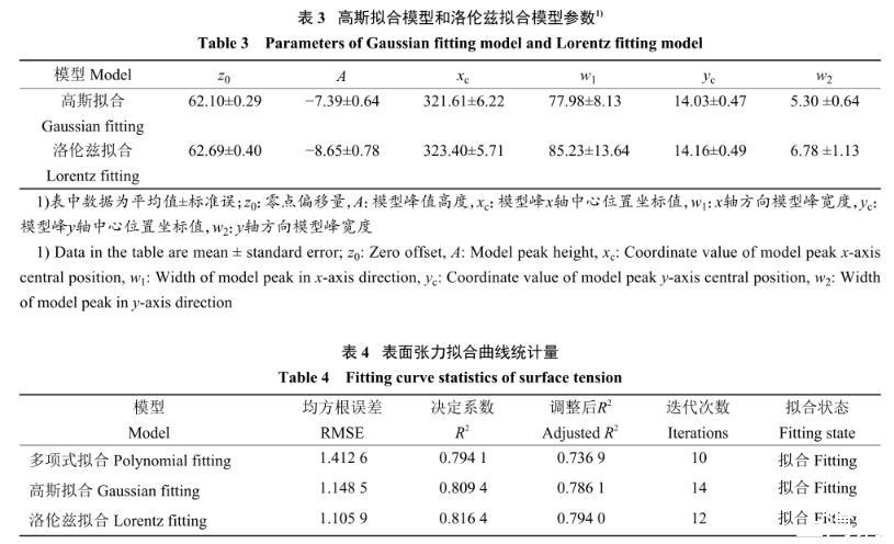 多項(xiàng)式擬合模型的參數(shù)(平均值±標(biāo)準(zhǔn)誤)如下所示:z0=116.16±43.94,A1=?0.23±0.10,A2=0.002±0.001,A3=(?1.19±0.45)×10?5,A4=(2.25±0.88)×10?8,A5=(?1.91±0.64)×10?11,B1=?19.950 0±19.724 9,B2=3.22±3.21,B3=?0.24±0.24,B4=0.009±0.008,B5=(?1.22±1.30)×10?4。表3為高斯擬合模型和洛倫茲擬合模型參數(shù),表4為溶液表面張力3種擬合曲線的統(tǒng)計(jì)量。由表4可以看出,3種擬合方式的決定系數(shù)(R2)均大于0.79,調(diào)整后R2(Adjusted R2)均大于0.73,這說明擬合函數(shù)有意義,且均方根誤差(Root mean square error,RMSE)都小于1.5。3種擬合模型均能夠描述磁場強(qiáng)度和磁化時(shí)長對除草劑溶液表面張力的影響,但相比較于其他2種擬合方式,洛倫茲擬合R2為0.816 4,調(diào)整后R2為0.794 0,兩者均大于其他2種擬合方式,R2與調(diào)整后R2越大,說明擬合效果越好;RMSE為1.105 9,均小于其他2種擬合方式,RMSE越小,說明預(yù)測模型描述試驗(yàn)數(shù)據(jù)越精確。