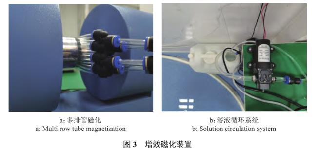 由于靜態(tài)磁化單次最多磁化50 mL溶液,而單次噴霧霧滴粒徑測試過程使用溶液量為1 L左右,因此,所有試驗(yàn)組使用的溶液均參照常規(guī)方式以一定流速通過磁場進(jìn)行磁化。為增加磁化效果,使用多排管和循環(huán)磁化方式對溶液進(jìn)行增效磁化,為避免霧滴粒徑測試過程中出現(xiàn)溶液量不足的現(xiàn)象,設(shè)定單次循環(huán)磁化溶液量為3 L,增效磁化裝置如圖3所示。磁化除草劑霧滴粒徑試驗(yàn)設(shè)計(jì)同表1,循環(huán)磁化時(shí)長與靜態(tài)磁化時(shí)長對應(yīng)一致,對照組與試驗(yàn)組共48組試驗(yàn)。處理1不進(jìn)行磁化處理,用霧滴粒徑儀重復(fù)測3次取平均值,為122.47μm,當(dāng)作對照值,試驗(yàn)中以體積中值直徑(Volume median diameter,VMD)表示霧滴直徑。處理2設(shè)置磁場強(qiáng)度為50 mT,循環(huán)磁化完畢后立即用激光粒度儀測磁化后溶液噴霧霧滴粒徑并記錄數(shù)據(jù)。之后每個(gè)處理磁場強(qiáng)度遞增50 mT,操作步驟參照處理2進(jìn)行。磁化溶液霧滴粒徑測試系統(tǒng)如圖4所示。
