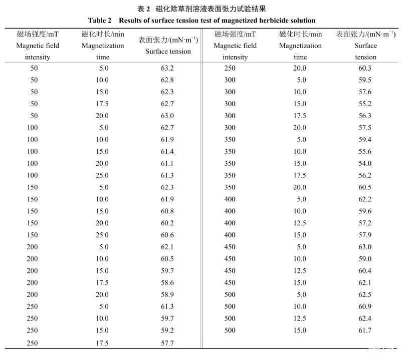 磁場強(qiáng)度和磁化時(shí)長對除草劑溶液表面張力、噴霧霧滴粒徑的影響(二)