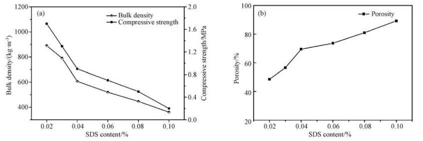 圖1為固含量60%、SDS摻量分別為0.02%、0.04%、0.06%、0.08%、0.1%下所制備的多孔陶瓷坯體,經過1190℃、保溫2 h燒結后的樣品性能。從圖中可以看出,多孔陶瓷樣品的體積密度和抗壓強度隨發泡劑摻量的增加而減小。當SDS的摻入量由0.02%提高至0.1%時,樣品的密度由890.53降至361.0 kg/m3,抗壓強度由1.7下降至0.2 MPa。當SDS溶于水并經過高速攪拌后,SDS分子可以吸附到氣液界面上降低表面張力并產生大量的氣泡,這些氣泡會緊密堆積在一起,氣泡之間有液膜將其隔開,將氣泡引入到陶瓷漿料中后,陶瓷原料分散在氣泡液膜間,形成骨架支撐,干燥后陶瓷原料液相消失,固化形成含孔隙的多孔陶瓷坯體,引入的氣泡越多,多孔陶瓷的孔隙率越高,孔壁越薄,陶瓷骨架越細;當氣泡的引入量過多時,骨架易發生斷裂,此時多孔陶瓷的抗壓強度就會降低。